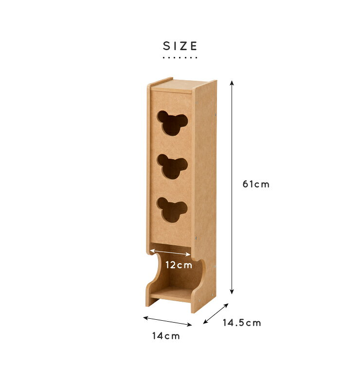 【サイズ】幅14×奥行き14.5×高さ61cm内寸:幅11.8×奥行11.8×高さ56cm【重量】約0.95kg【素材】MDF【原産国】日本■特長・場所をとらないスリムな収納です・くまのモチーフが可愛らしいワンポイントになっています・ペーパーを最大5個収納できます・入れたペーパーは下の開きからサッと取り出すことができて便利です【送料について】北海道、沖縄、離島は別途送料を頂きます。