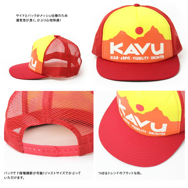 こちらの商品は【帽子3点以上後購入で送料無料】対象商品です! メール便不可 【他おすすめはこちら】 タイプ KAVU サブライム メッシュキャップ ベールボールキャップ 野球帽 アウトドア スポーツ キャンプ 紫外線対策 2014 春夏 新作KAVU(カブー)から新作アイテムが入荷しました! サイドとバッグがメッシュになっており、通気性が良く暑い日でも快適にかぶっていただけます。