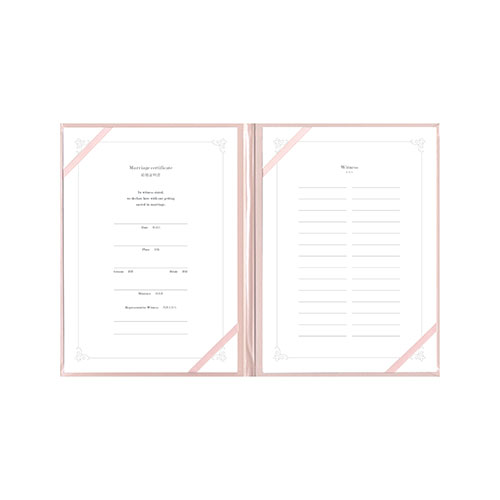 商品内容結婚証明書 レースピンク サイズ外寸:269X195mm 仕様シート257X182、結婚証明書・立会人シート各1枚付・箱付・立会人の署名欄は28名です。