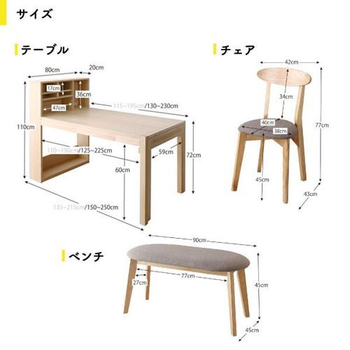 ■テーブル(W120-200)【サイズ】幅135-215 奥行80 高さ72cm【材質】天板:天然木化粧板(アッシュ) 脚部:天然木(ラバーウッド) 仕上げ:ウレタン樹脂塗装【製品重量】56kg【梱包数】2【梱包サイズ/重量】 (2-1)天板:130 89 17cm/33kg (2-2)脚:119 89 31cm/25kg【生産国】ベトナム※組立品■テーブル(W135-235)【サイズ】幅135-235 奥行80 高さ72cm【材質】天板:天然木化粧板(アッシュ) 脚部:天然木(ラバーウッド) 仕上げ:ウレタン樹脂塗装【製品重量】59kg【梱包数】2【梱包サイズ/重量】 (2-1)天板:135 90 22cm/36kg (2-2)脚:119 89 31cm/25kg【生産国】ベトナム※組立品■チェア(2脚組) 【サイズ】幅42 奥行43 高さ77(座面高45)cm【材質】フレーム:天然木(ラバーウッド) 張地:ポリエステル クッション材:ウレタンフォーム【カラー】ライトグレー/ブラウン/ブルー【製品重量】4kg(1脚)【梱包数】1 【梱包サイズ/重量】 (2-1)79 60.5 13cm/5kg (2-2)79 60.5 13cm/5kg【生産国】マレーシア※組立品■ベンチ【サイズ】幅90 奥行40 高さ45cm【材質】フレーム:天然木(ラバーウッド) 張地:ポリエステル クッション材:ウレタンフォーム【カラー】ライトグレー/ブラウン【製品重量】5kg(1脚)【梱包数】1 【梱包サイズ/重量】94.5 43 12.5cm/7kg【生産国】マレーシア※組立品■4点セットセット内容:テーブル 1、チェア 2、ベンチ 1梱包数:5■5点セットセット内容:テーブル 1、チェア 4梱包数:6■6点セットセット内容:テーブル 1、チェア 4、ベンチ 1梱包数:7■7点セットセット内容:テーブル 1、チェア 6梱包数:8■8点セットセット内容:テーブル 1、チェア 6、ベンチ 1梱包数:9■9点セットセット内容:テーブル 1、チェア 8梱包数:10※サイズ・重量は概算です。